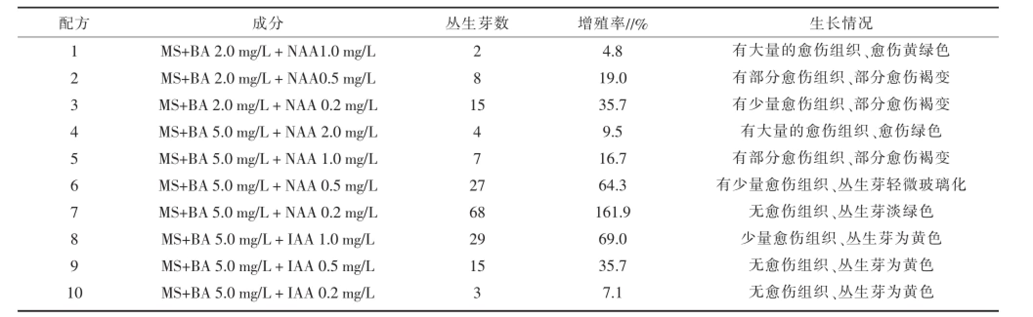1.2.3 壮苗培养选择合适的培养基诱导出丛生芽后,将丛生芽取出放入壮苗培养基中,继续生长。各培养基配方均是在MS培养基基础上添加不同种类、不同浓度的植物生长调节剂。每个配方接种6瓶,每瓶接种4个丛生芽。30 d后观察丛生芽生长情况。