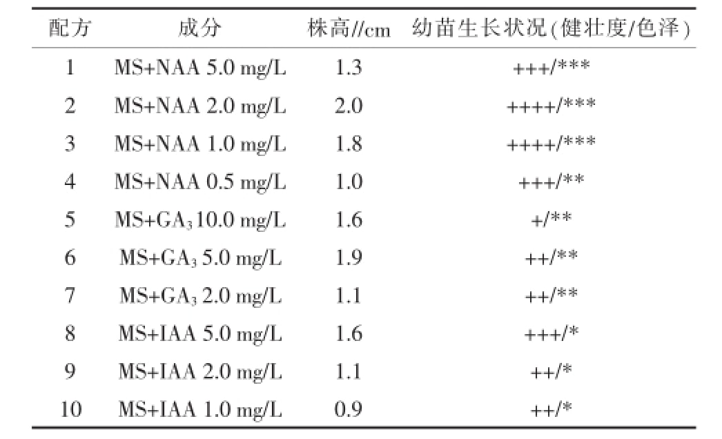 丛生芽诱导和壮苗培养的条件为培养基中含蔗糖3%,琼脂0.7%,pH 5.6~6. 0;培养温度25~28℃,光照时间14 h/d,光照度2 000~2 500 lx。