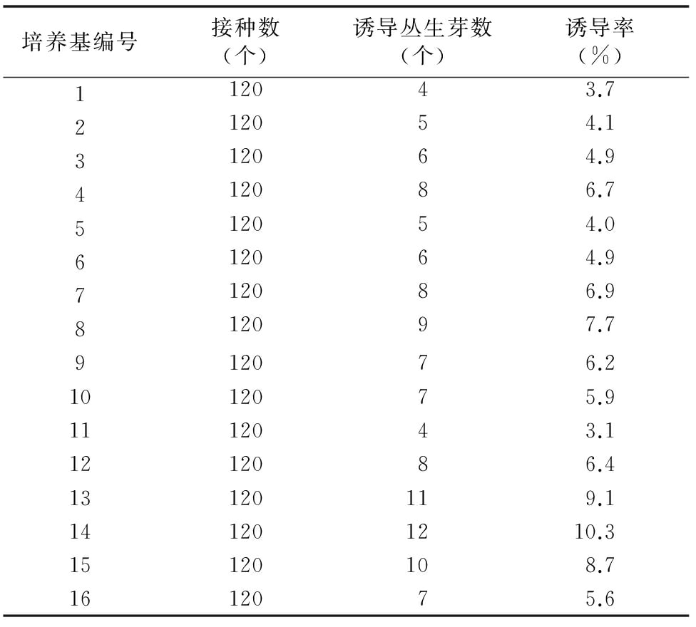1.2.3 高诱导率外植体的筛选 在超净工作台中,将无菌苗的下胚轴、叶柄、丛生芽块均切成长约1 cm的小段,分别置于筛选出的佳不定芽诱导率培养基,根据不同类型外植体诱导率,确定诱导率高的培养基。3种不同类型的外植体均接种120个。