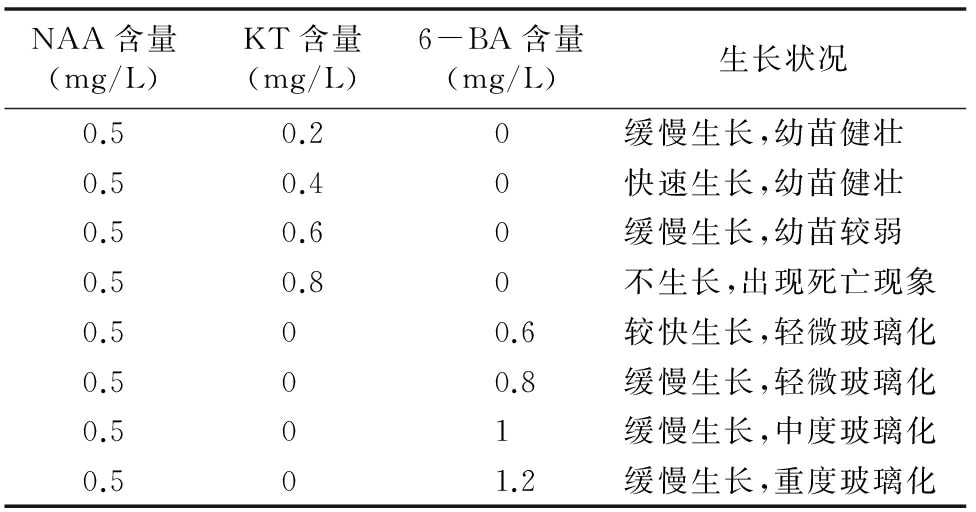 1.2.4 继代培养基的选择 当诱导的丛生芽长到约1 cm时,在超净工作台中将丛生芽分切为单苗,接种于继代培养基中进行继代培养(表2),根据不同培养基中幼苗生长情况,筛选佳继代培养基。