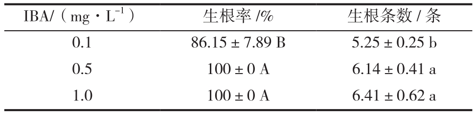 以MS为基本培养基,添加IBA,浓度分别设定为0.1、0.5、1.0 mg/L,切取2.0 cm左右健壮一致的微枝转接到生根培养基上诱导生根,共3个处理,每个处理接种50株,重复3次,25 d调查生根率、生根条数。