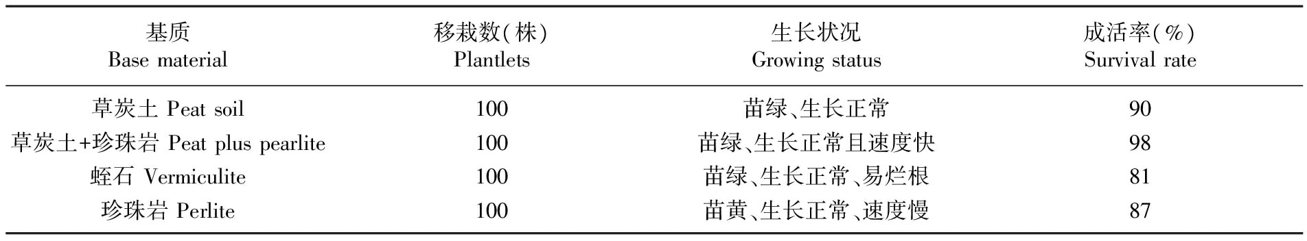 当增殖培养的瓶苗长到1.5~2 cm时,把1.5 cm及以上的带气生根的苗子切下来,然后用水洗净根部的培养基,移栽到装有不同基质(草炭、草炭与珍珠岩6∶1混合、蛭石、珍珠岩)的穴盘中,每种处理100株。前期置于空气湿度80%以上,温度控制在27~30℃。后期湿度可降低到60%左右,每3~4 d喷施一次多菌灵1 000倍液(50%可湿性粉剂)。待驯化20~25 d后逐渐撤去薄膜,进行种苗正常管理并统计成活率。