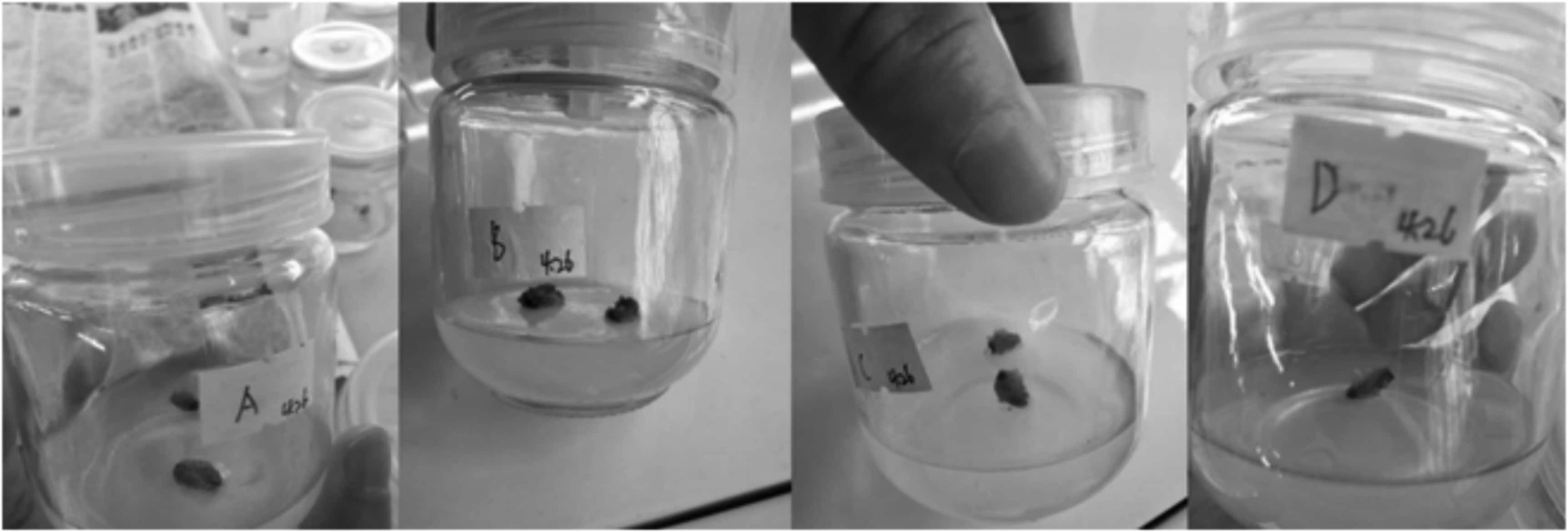 将丛生芽发出较好的的四个品种切分为带3-4片叶的芽簇,接入1/2 MS+IBA 1.5 mg·L-1+NAA 1 mg·L-1培养基内进行培养30 d后四个不同品种生根情况见图4。