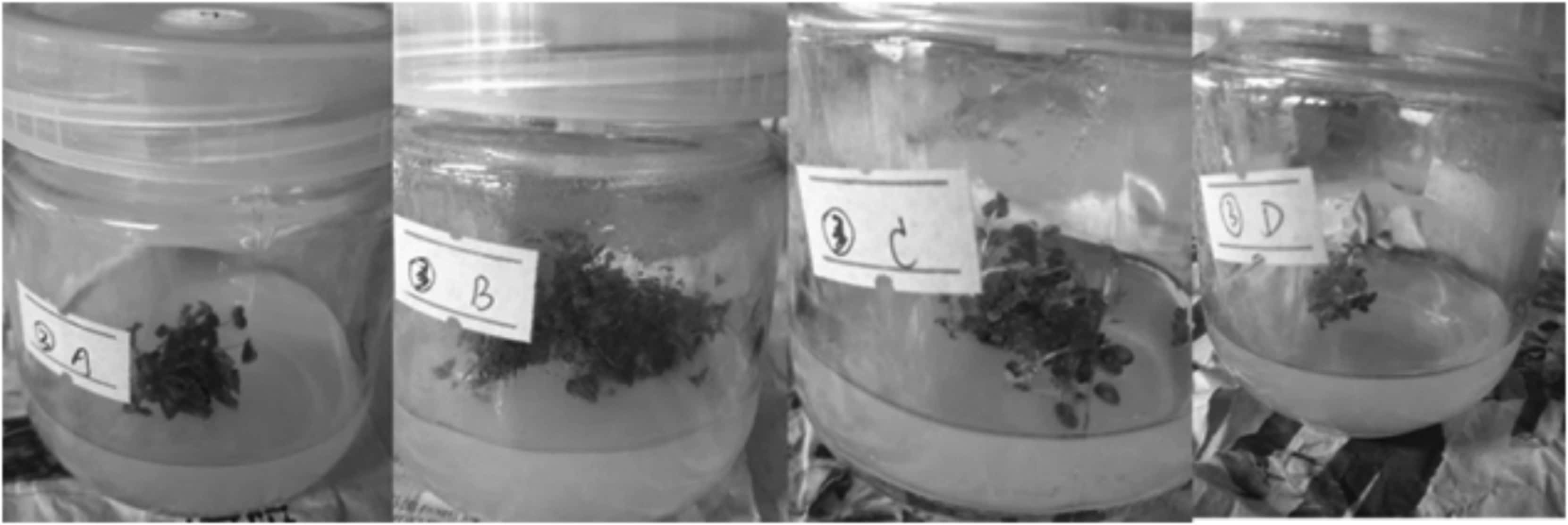 经SPSS 19对品种与激素配方两个因素有重复的统计分析结果表明:品种间差异存在显著差异,其中B品种“莱姆里奇”增殖系数最高,平均可达3.48,A品种“狂野”次之,C品种“黄桃派”和D品种“乔治亚桃子”差异不显著;不同激素配方间差异显著,其中采用6-BA0.2 mg·L-1 +NAA0.05 mg·L-1的诱导率达4.2,效果很好,6-BA0.2 mg·L-1 +NAA0.01 mg·L-1,诱导效果最差,诱导效果见图2。