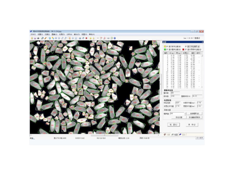 1.软件可自动计算出粒型的指标,主要包括每个米粒的长、宽、长宽 比、面积和碎米标记;米粒总数,米粒长、宽和长宽比的平均值;米粒的整米数、碎米数、整精米率;